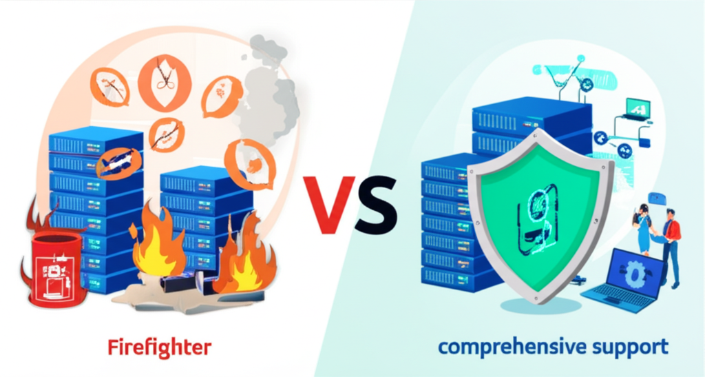 Некоторые компании предлагают только «пожарное» реагирование: чинят, когда уже сломалось. Другие работают комплексно: мониторят оборудование, обновляют системы, следят за безопасностью и помогают сотрудникам.